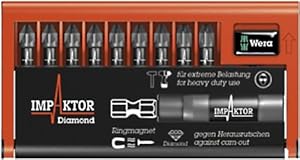 Wera Impaktor 8755-9/IMP Bit-Check Pozi 9 Piece Set WER057684The Wera 8755-9/IMP DC Bit-Check Pozi 9 Piece Set has an Impaktor holder with retaining ring and ring magnet in the chuck for a secure fit of the bits in the holder and 9 Impaktor bits.